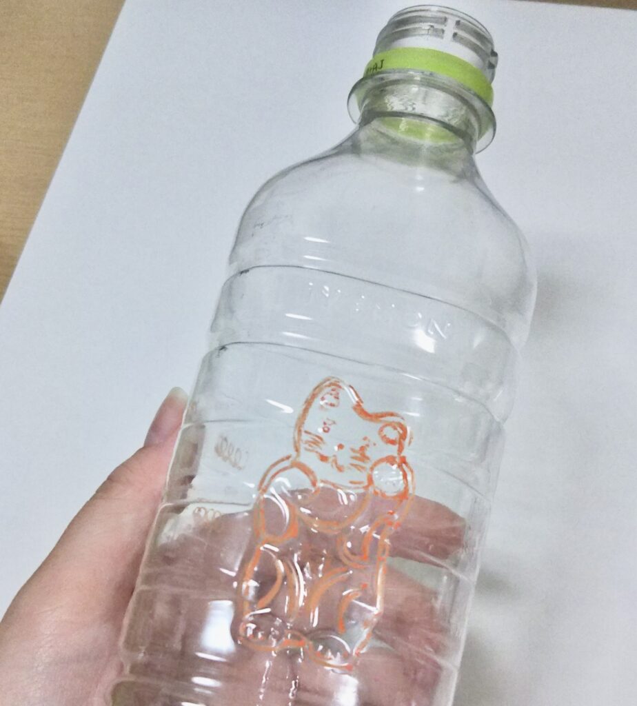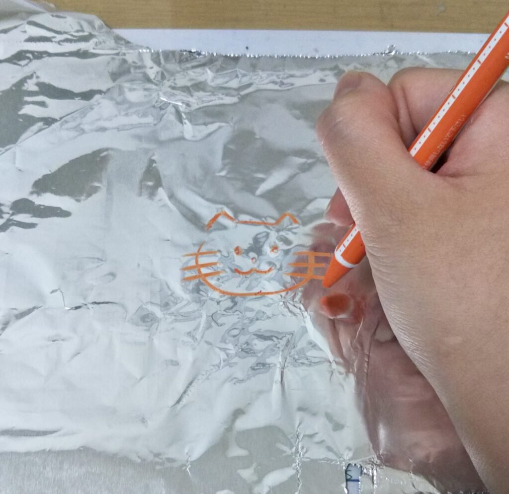 このポンキーペンシル、なんとペットボトルにもアルミホイルにも描ける!!そのほか木材や粘土にも描けるそうです。