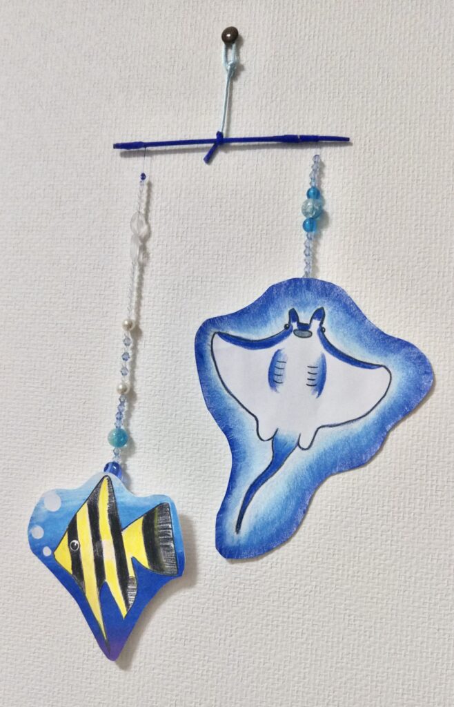 もうすぐ夏なのでポンキーペンシルで描いた絵をモビールにしたものを貼り付けておきます。混色がしやすくておすすめです!